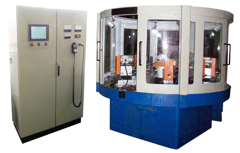 噴油嘴數(shù)控回轉(zhuǎn)鉆床主要用于噴油嘴針閥體偶件淬火前的粗加工工序,是通過一次裝夾,在一個幾何回轉(zhuǎn)中心上,通過工位的轉(zhuǎn)換,分別完成預(yù)鉆中心孔、中孔、平底、倒角、座面、大端面、壓力室等工序的加工、解決了傳統(tǒng)工藝在不同設(shè)備上分別加工中孔、座面、壓力室、大端面等因重復(fù)裝夾出現(xiàn)的質(zhì)量和合格率低的問題;通過該機(jī)床加工后,充分保證后續(xù)加工余量均勻而少,為淬火后精加工提高生產(chǎn)效率,提高產(chǎn)品質(zhì)量,為柴油機(jī)排放達(dá)到歐Ⅳ標(biāo)準(zhǔn)奠定了基礎(chǔ),該機(jī)床分度機(jī)構(gòu)采用高精度梳齒盤回轉(zhuǎn)工作臺,總體結(jié)構(gòu)設(shè)計合理,加工精度高;添補(bǔ)了國內(nèi)外空白。